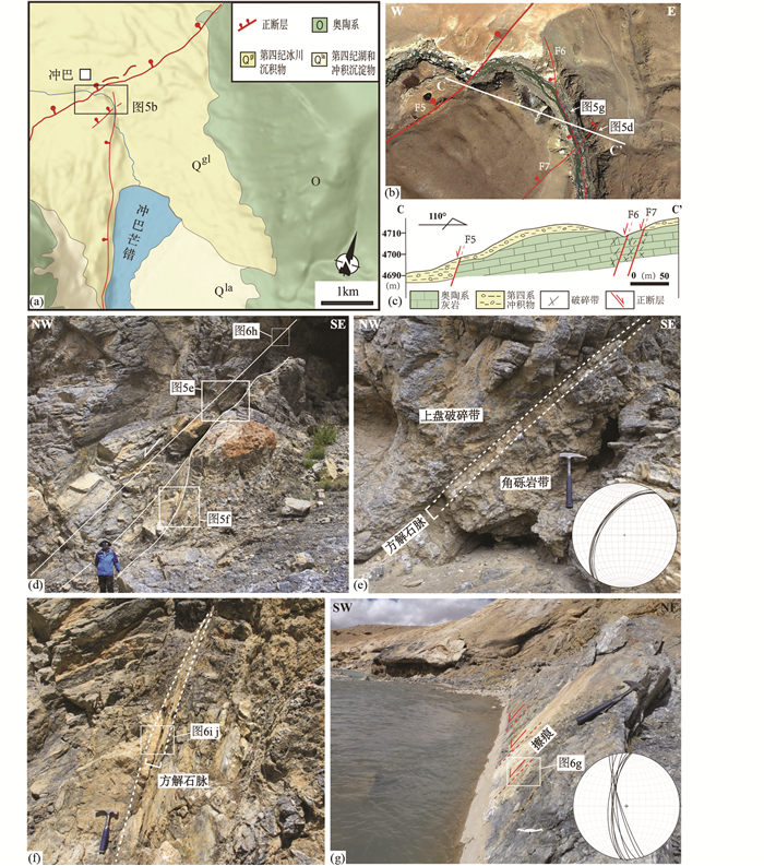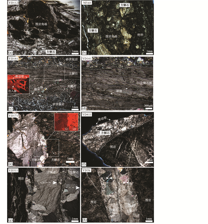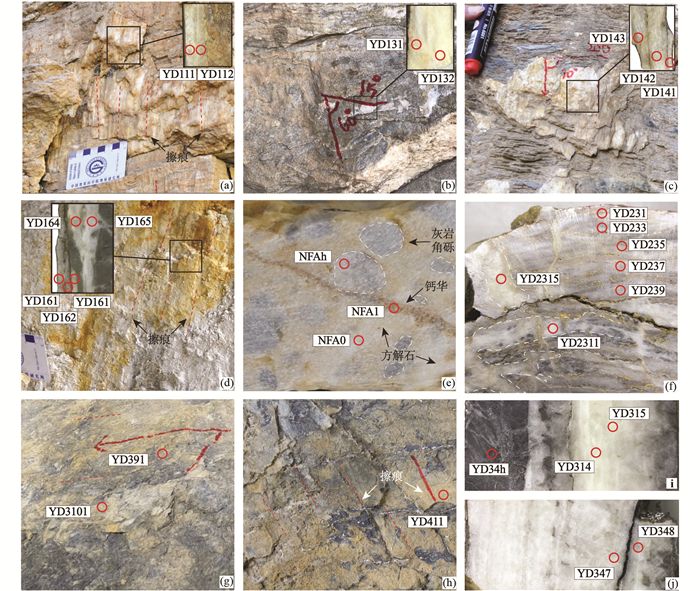 断层活动相关的方解石脉体野外宏观构造特征及采样位置
