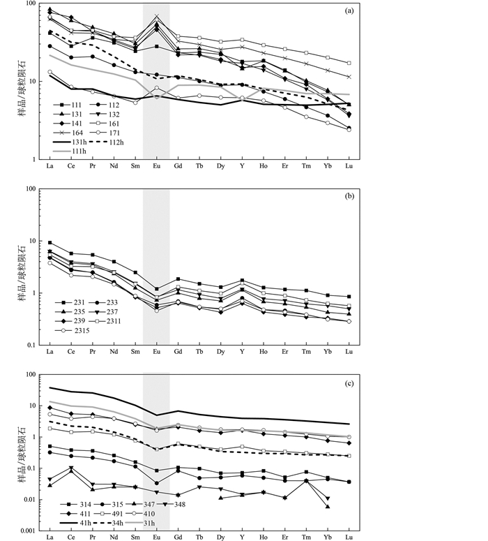 达凯研究点(a)、土热勒研究点(b)和冲巴研究点(c)方解脉和围岩的球粒陨石标准化REY模式(标准化值据Haskin et al., 1968)